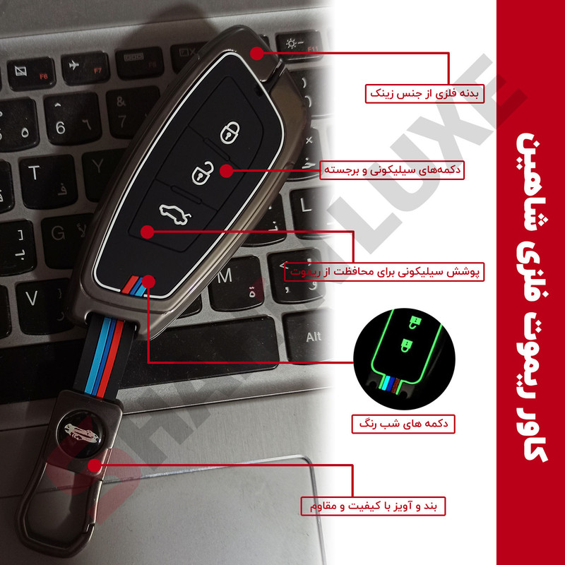 این محصول از چند بخش اصلی تشکیل شده است که با ترکیب یکدیگر یک مجموعه کامل را تشکیل میدهند: بدنه فلزی از جنس زینک پیچهای اتصال بدنه به همراه چند پیچ یدک بند سیلیکونی و کاور سیلیکونی ریموت آویز فلزی بسیار با کیفیت پیچ گوشتی برای بازکردن و بستن ریموت